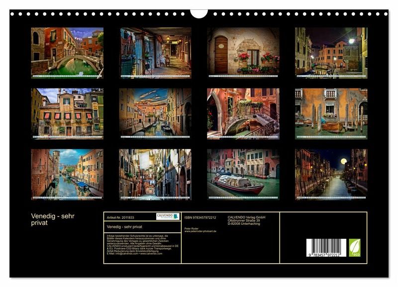 Wer die traumhafte Stadt ohne die Touristenmassen erleben will, findet dieses gemütliche Venedig nur wenige Gehminuten vom Markusplatz entfernt. Einfach in die originären Stadtteile Castello, Dorsoduro oder Cannaregio schlendern und schon befindet man sich dort, wo noch Hunde in der Sonne dösen, Hausfrauen in kleinen Läden einkaufen und Wäsche an den Leinen zwischen den Häusern trocknet. Für diesen Kalender hat der Fotokünstler Peter Roder zwölf wunderschöne Aufnahmen dieser einzigartigen Stadt zusammengestellt und gestaltet, ein zauberhafter Hingucker für das ganze Jahr.