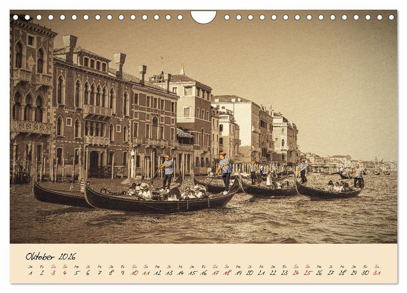 Venedig - Seppia e tinta: übersetzt Sepia und Farbe zeigt eindrucksvolle Fotografien im Sepia-Look mit kunstvoll kolorierten Details. Durch diese Bearbeitung wirken die Kalenderbilder sehr edel und sind nicht nur ein toller Hingkucker, sondern auch ein aparter Wandschmuck für jeden Raum.