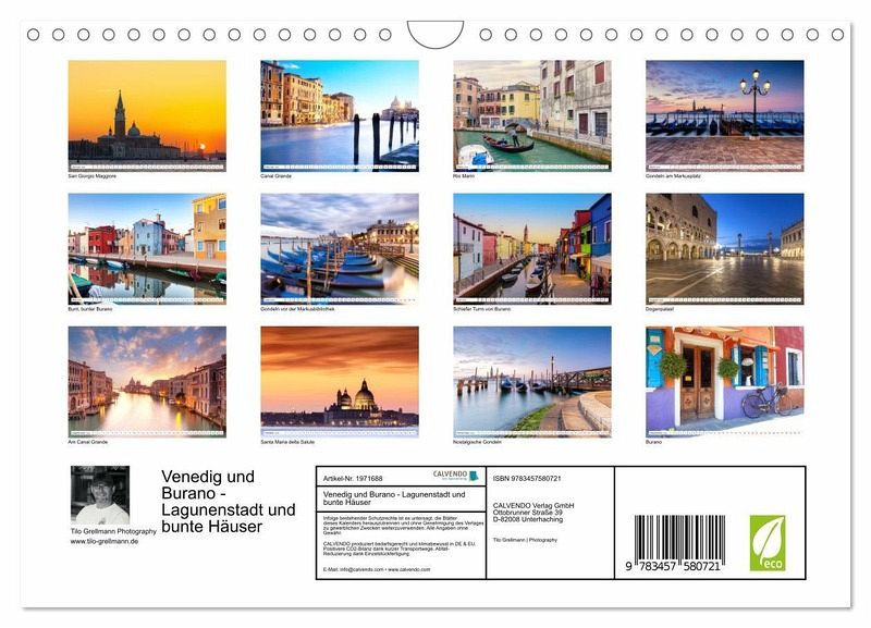 Für diesen Kalender hat der Fotograf Tilo Grellmann dreizehn beeindruckende Aufnahmen aus der Lagunenstadt Venedig und der bunten Nachbarinsel Burano zusammengestellt und gestaltet. Lassen sie sich verzaubern, Tag für Tag und Monat für Monat. Dieser erfolgreiche Kalender wurde dieses Jahr mit gleichen Bildern und aktualisiertem Kalendarium wiederveröffentlicht.