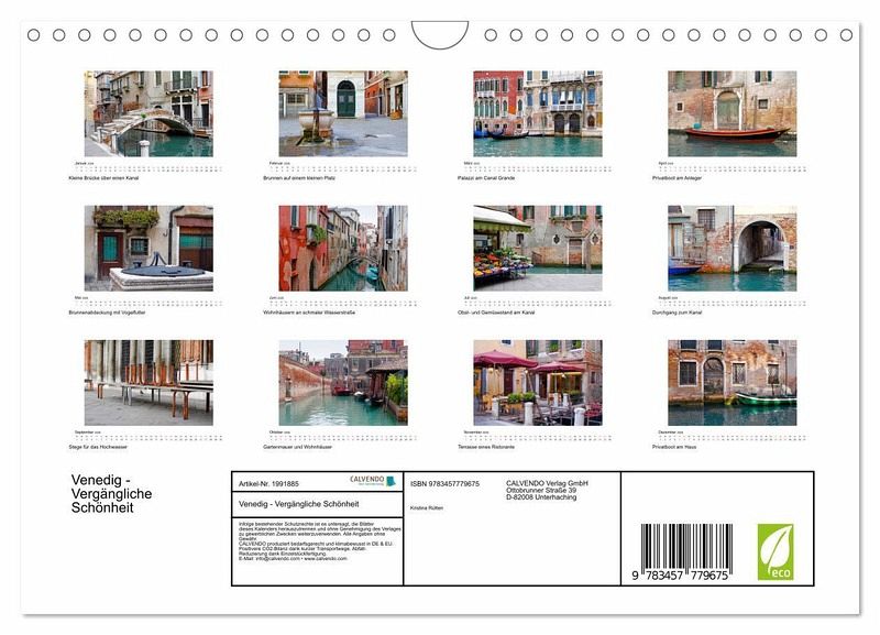QUALITÄT - Hochwertiger Fotokalender mit 12 wunderschönen Motiven auf lichtbeständigem Bilderdruckpapier, robuste Spiralbindung mit Aufhängebügel.NACHHALTIG - deutliche Abfallreduzierung durch bedarfsgerechte Einzelstückfertigung, umweltfreundliches FSC-zertifiziertes Papier, Produktion in Deutschland, klimabewusste Logistik.PERFEKTES GESCHENK - Kalender für Freunde und Familie, für Kinder und Erwachsene, jung und alt, zu Weihnachten, Geburtstag oder zwischendurch.VIELFALT -Bildkalender in verschiedenen Formaten, z.B. DIN A5, DIN A4, DIN A3 sowie DIN A2. Ob Naturmotiv, Gemälde oder Fotos, ideal für ein persönliches Wohlfühlambiente.Venezianische Impressionen jenseits der Sehenswürdigkeiten von Autor(in): Kristina Rütten