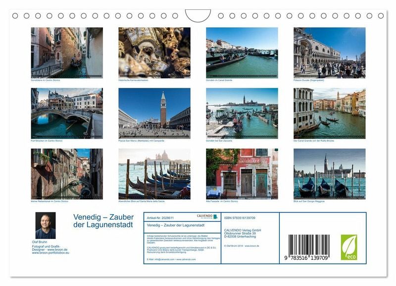 QUALITÄT - Hochwertiger Fotokalender mit 12 wunderschönen Motiven auf lichtbeständigem Bilderdruckpapier, robuste Spiralbindung mit Aufhängebügel.NACHHALTIG - deutliche Abfallreduzierung durch bedarfsgerechte Einzelstückfertigung, umweltfreundliches FSC-zertifiziertes Papier, Produktion in Deutschland, klimabewusste Logistik.PERFEKTES GESCHENK - Kalender für Freunde und Familie, für Kinder und Erwachsene, jung und alt, zu Weihnachten, Geburtstag oder zwischendurch.VIELFALT - Bildkalender in verschiedenen Formaten, z.B. DIN A5, DIN A4, DIN A3 sowie DIN A2. Ob Naturmotiv, Gemälde oder Fotos, ideal für ein persönliches Wohlfühlambiente.13 stimmungsvolle Venedig-Fotografien von Olaf Bruhn. von Autor(in): Olaf Bruhn