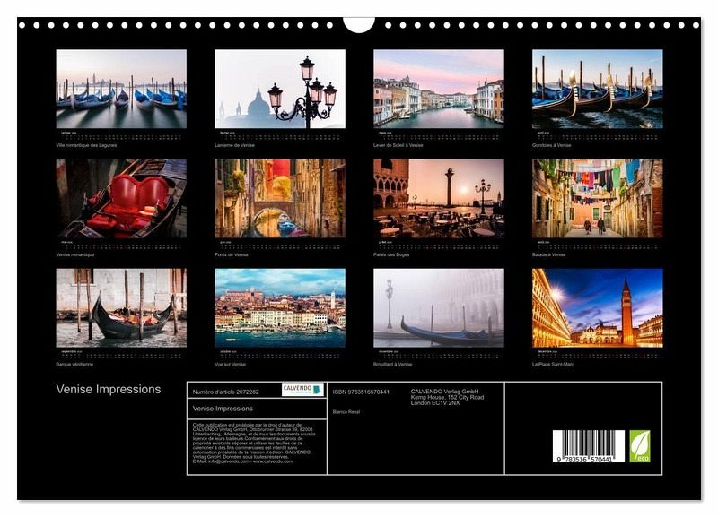 Venise est une des villes les plus pittoresques d'Europe. Laissez-vous émerveiller par cette cité fantastique, son labyrinthe de ruelles, ses ponts, ses canaux et ses gondoles.Ce calendrier vous fera découvrir toutes les facettes de la ville des amoureux.