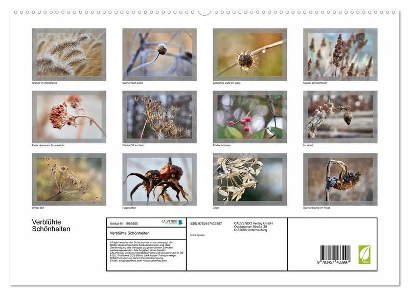 PREMIUM-LINIE - Brillanter Fotokalender mit 12 wunderschönen Motiven, Kunstdruck in Hochglanz in Museumsqualität.QUALITÄT - edle Materialien, stabile Rückwand mit 2 innovativen Einstecktaschen für eine optimale Präsentation an der Wand.NACHHALTIG - deutliche Abfallreduzierung durch bedarfsgerechte Einzelstückfertigung, umweltfreundliches FSC-zertifiziertes Papier, Produktion in Deutschland, klimabewusste Logistik.PERFEKTES GESCHENK - Kalender für Freunde und Familie, für Kinder und Erwachsene, jung und alt, zu Weihnachten, Geburtstag oder zwischendurch.Die Ästhetik verblühter Pflanzen von Autor(in): Petra Spieß