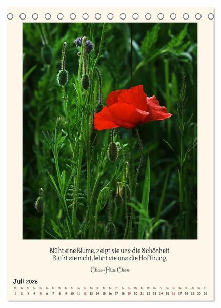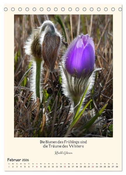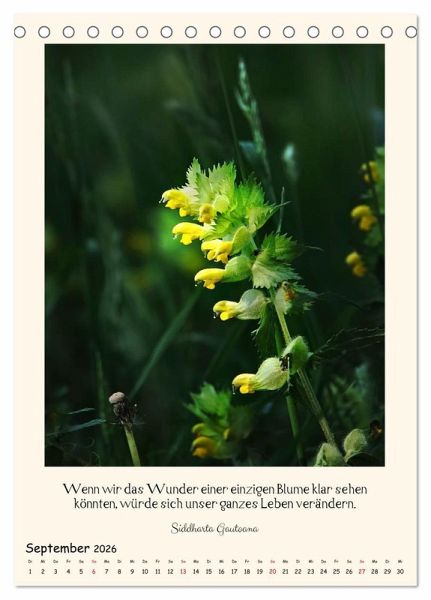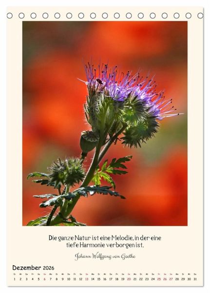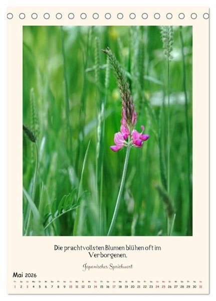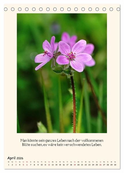 Der erfolgreiche Kalender: "Unscheinbare Schönheiten am Wegesrand" erhält hier einen Nachfolger. Die Fotografin hat auch dieses mal zum Teil winzige Blümchen aufgespürt. Es erstaunt immer wieder von Neuen, wie vollkommen und schön diese Winzlinge sind Mit den passenden Zitaten bereitet dieser Kalender Monat für Monat viel Freude.