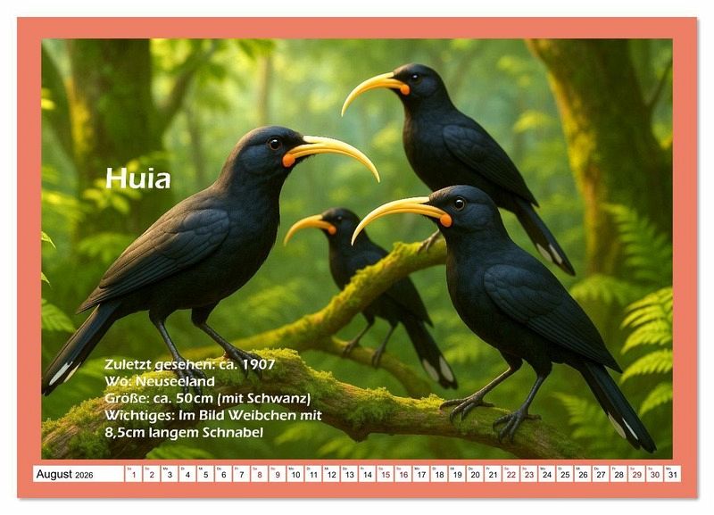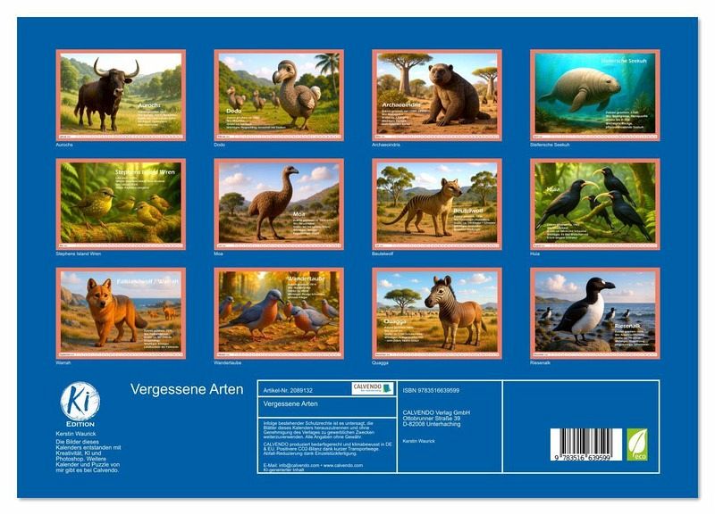 Tauche ein in eine faszinierende Bilderwelt ausgestorbener Tiere - von der KI erschaffen, um sie wieder vor Augen zu führen. Jeder Kalender zeigt Szenen, wie sie einst gewesen sein könnten - realistisch inspiriert, aber nicht bis ins letzte Detail historisch garantiert. Entdecke mit uns Tiere, die verschwunden sind, aber noch immer beeindrucken. Ein Kalender für Neugierige, Naturliebhaber und alle, die Geschichte lebendig sehen wollen.