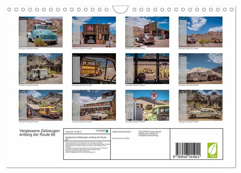 QUALITÄT - Hochwertiger Fotokalender mit 12 wunderschönen Motiven auf lichtbeständigem Bilderdruckpapier, robuste Spiralbindung mit Aufhängebügel.NACHHALTIG - deutliche Abfallreduzierung durch bedarfsgerechte Einzelstückfertigung, umweltfreundliches FSC-zertifiziertes Papier, Produktion in Deutschland, klimabewusste Logistik.PERFEKTES GESCHENK - Kalender für Freunde und Familie, für Kinder und Erwachsene, jung und alt, zu Weihnachten, Geburtstag oder zwischendurch.VIELFALT - Bildkalender in verschiedenen Formaten, z.B. DIN A5, DIN A4, DIN A3 sowie DIN A2. Ob Naturmotiv, Gemälde oder Fotos, ideal für ein persönliches Wohlfühlambiente.Zeitzeugen entlang der westlichen Route 66 in zahlreichen Bildern dokumentiert von Autor(in): MIBSTUDIOS