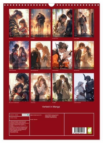 Manga - der japanischen Comic Zeichenstil, ist viel mehr als nur ein Comicstil. Es ist ein Lebensgefühl. Die typischen Zeichnungen im Manga Stil, auch Anime genannt, fangen vor allem den emotionalen Ausdruck der Figuren hervorragend ein. Längst ist es nicht mehr nur ein "Kinder-Ding", sondern auch viele Erwachsene lieben die Manga Figuren. In diesem Kalender sind zwölf Bilder zum Träumen vereint.