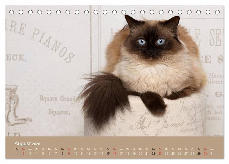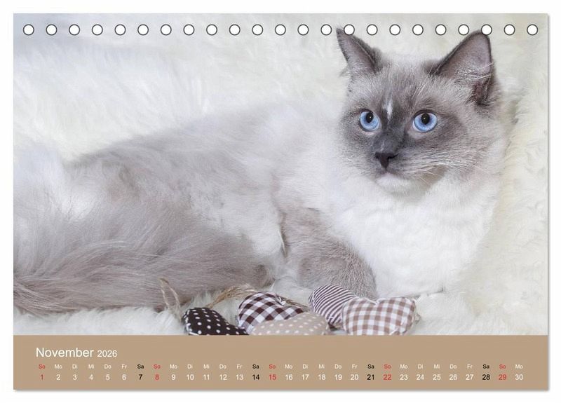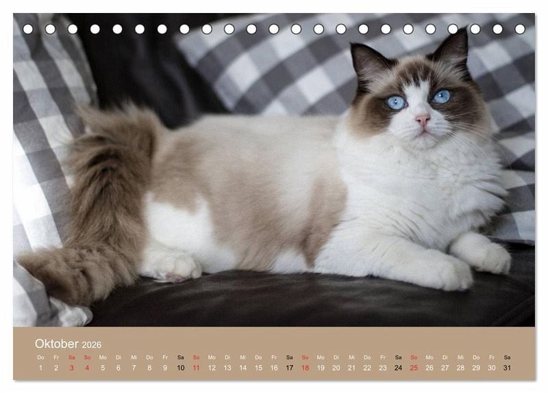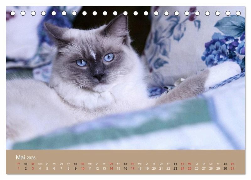 Die wunderschöne Ragdoll mit ihren strahlend blauen Augen ist sehr menschenbezogen und von ausgeglichenem und ruhigem Charakter. In diesem Kalender zeigt die Fotografin Marion Reiß-Seibert 13 zauberhafte Farbaufnahmen der aus Kalifornien stammenden Rassekatze .