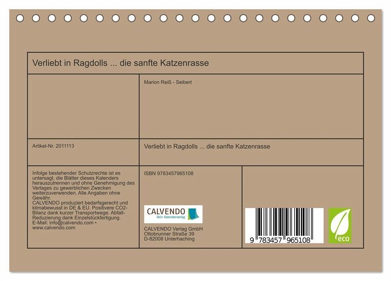 QUALITÄT - Hochwertiger Fotokalender mit 12 wunderschönen Motiven auf lichtbeständigem Bilderdruckpapier, robuste Spiralbindung.NACHHALTIG - deutliche Abfallreduzierung durch bedarfsgerechte Einzelstückfertigung, umweltfreundliches FSC-zertifiziertes Papier, Produktion in Deutschland, klimabewusste Logistik.PERFEKTES GESCHENK - Kalender für Freunde und Familie, für Kinder und Erwachsene, jung und alt, zu Weihnachten, Geburtstag oder zwischendurch.VIELFALT - Bildkalender in verschiedenen Formaten, z.B. DIN A5, DIN A4, DIN A3 sowie DIN A2. Ob Naturmotiv, Gemälde oder Fotos, ideal für ein persönliches Wohlfühlambiente.Die Ragdoll ist eine sanfte Halblanghaarkatze von Autor(in): Marion Reiß - Seibert
