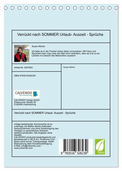 QUALITÄT - Hochwertiger Fotokalender mit 12 wunderschönen Motiven auf lichtbeständigem Bilderdruckpapier, robuste Spiralbindung.NACHHALTIG - deutliche Abfallreduzierung durch bedarfsgerechte Einzelstückfertigung, umweltfreundliches FSC-zertifiziertes Papier, Produktion in Deutschland, klimabewusste Logistik.PERFEKTES GESCHENK - Kalender für Freunde und Familie, für Kinder und Erwachsene, jung und alt, zu Weihnachten, Geburtstag oder zwischendurch.VIELFALT - Bildkalender in verschiedenen Formaten, z.B. DIN A5, DIN A4, DIN A3 sowie DIN A2. Ob Naturmotiv, Gemälde oder Fotos, ideal für ein persönliches Wohlfühlambiente.Genieße den Sommer - er ist zu kurz ! von Autor(in): Susan Michel