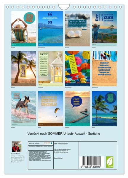 QUALITÄT - Hochwertiger Fotokalender mit 12 wunderschönen Motiven auf lichtbeständigem Bilderdruckpapier, robuste Spiralbindung mit Aufhängebügel.NACHHALTIG - deutliche Abfallreduzierung durch bedarfsgerechte Einzelstückfertigung, umweltfreundliches FSC-zertifiziertes Papier, Produktion in Deutschland, klimabewusste Logistik.PERFEKTES GESCHENK - Kalender für Freunde und Familie, für Kinder und Erwachsene, jung und alt, zu Weihnachten, Geburtstag oder zwischendurch.VIELFALT - Bildkalender in verschiedenen Formaten, z.B. DIN A5, DIN A4, DIN A3 sowie DIN A2. Ob Naturmotiv, Gemälde oder Fotos, ideal für ein persönliches Wohlfühlambiente.Genieße denSommer - er ist zu kurz ! von Autor(in): Susan Michel