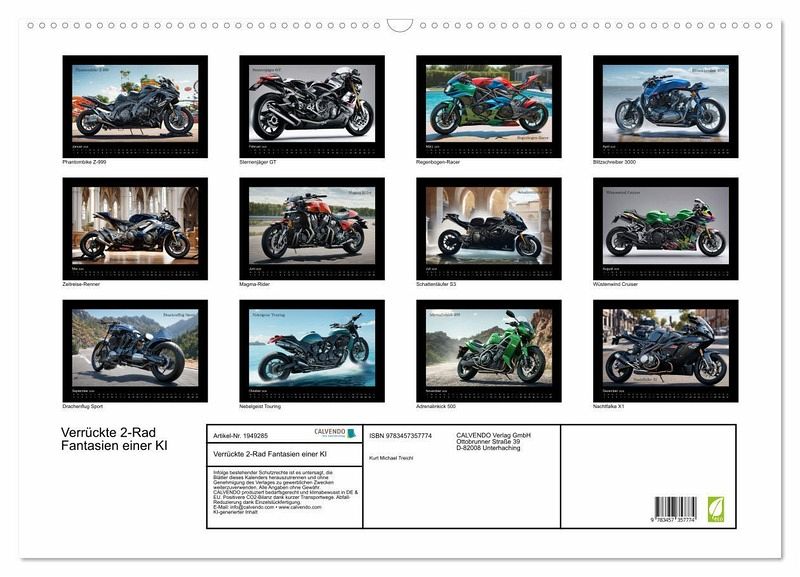 QUALITÄT - Hochwertiger Fotokalender mit 12 wunderschönen Motiven auf lichtbeständigem Bilderdruckpapier, robuste Spiralbindung mit Aufhängebügel.NACHHALTIG - deutliche Abfallreduzierung durch bedarfsgerechte Einzelstückfertigung, umweltfreundliches FSC-zertifiziertes Papier, Produktion in Deutschland, klimabewusste Logistik.PERFEKTES GESCHENK - Kalender für Freunde und Familie, für Kinder und Erwachsene, jung und alt, zu Weihnachten, Geburtstag oder zwischendurch.VIELFALT - Bildkalender in verschiedenen Formaten, z.B. DIN A5, DIN A4, DIN A3 sowie DIN A2. Ob Naturmotiv, Gemälde oderFotos, ideal für ein persönliches Wohlfühlambiente.Entdecken Sie 2-Rad Fantasien einer KI! Präsentiert werden 12 fiktive Motorräder, die zum Träumen und Schmunzeln einladen. Lassen Sie Ihrer Fantasie freien Lauf! von Autor(in): KMT KI Media