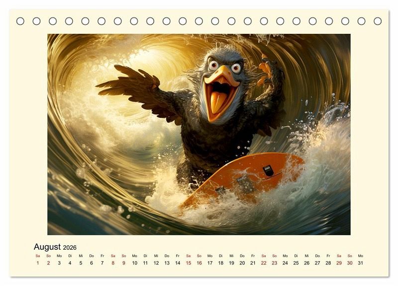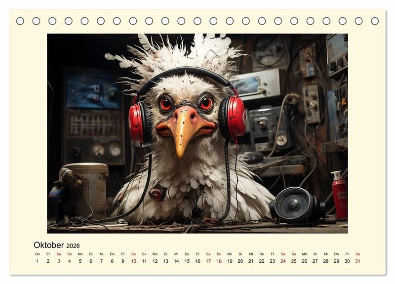 Dieser Kalender zeigt dir 12 lustige Bilder, die von einer künstlichen Intelligenz generiert wurden. Die verrückten Hühner und anderes witziges Federvieh in bunten Illustrationen werden dich jeden Tag zum Lachen bringen und dir deinen Alltag positiv stimmen.