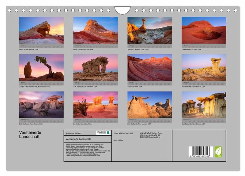 QUALITÄT - Hochwertiger Fotokalender mit 12 wunderschönen Motiven auf lichtbeständigem Bilderdruckpapier, robuste Spiralbindung mit Aufhängebügel.NACHHALTIG - deutliche Abfallreduzierung durch bedarfsgerechte Einzelstückfertigung, umweltfreundliches FSC-zertifiziertes Papier, Produktion in Deutschland, klimabewusste Logistik.PERFEKTES GESCHENK - Kalender für Freunde und Familie, für Kinder und Erwachsene, jung und alt, zu Weihnachten, Geburtstag oder zwischendurch.VIELFALT - Bildkalender in verschiedenen Formaten, z.B. DIN A5, DIN A4, DIN A3 sowie DIN A2. Ob Naturmotiv, Gemälde oder Fotos, ideal für ein persönliches Wohlfühlambiente.Eine bunte Bilderreise durch den steinigen Südwesten der USA von Autor(in): Jeanny Müller