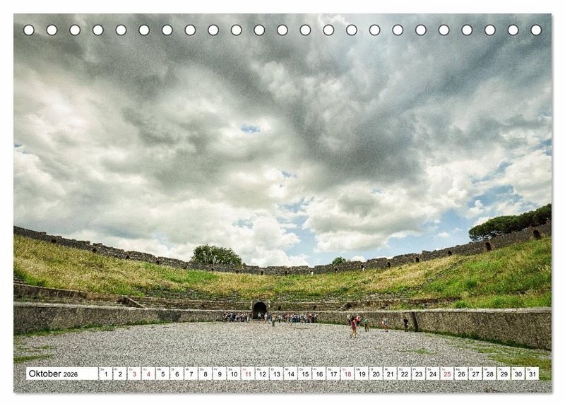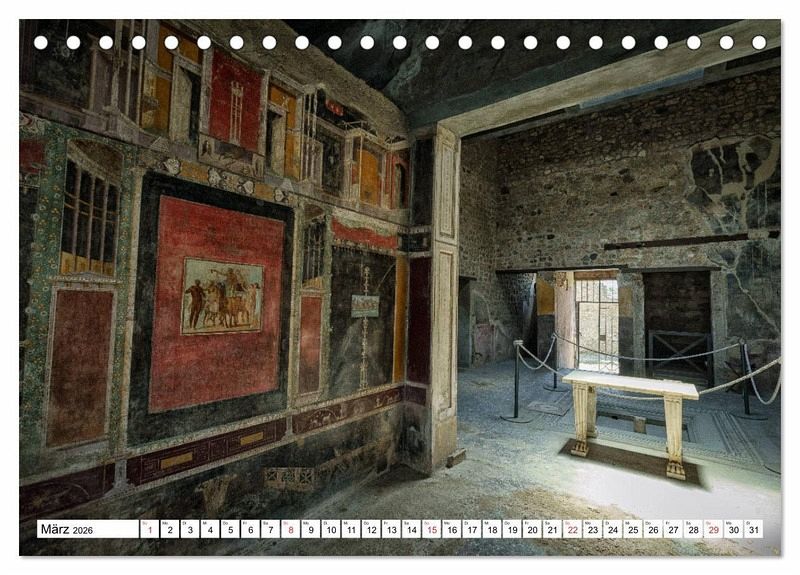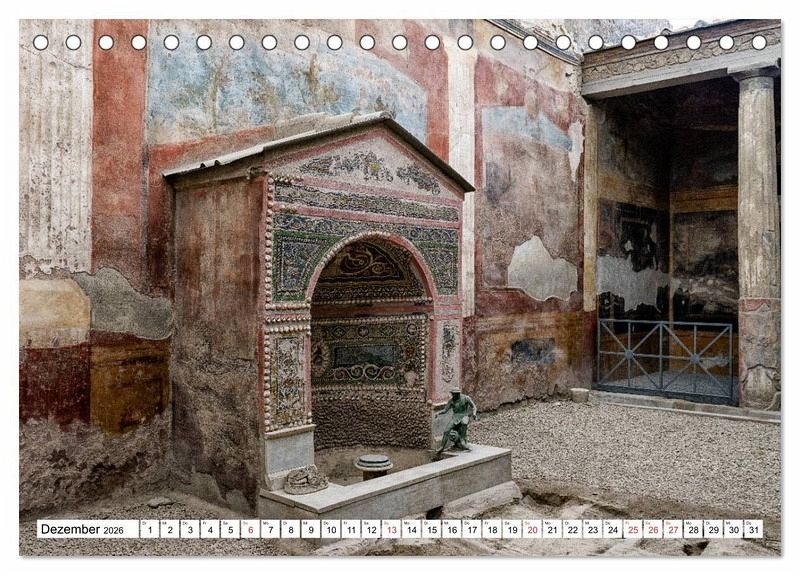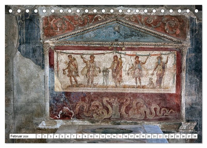 Im Jahre 79 n. Chr. verschüttete der Vesuv die antike Stadt Pompeji unter seinen Lava- und Aschemassen. Die moderne Archäologie bringt nun diese phantastischen Buten zurück an das Licht. Der Kalender zeigt das ganze Jahr über verschiedene Facetten dieses einzigartigen Relikts aus der römischer Antike.