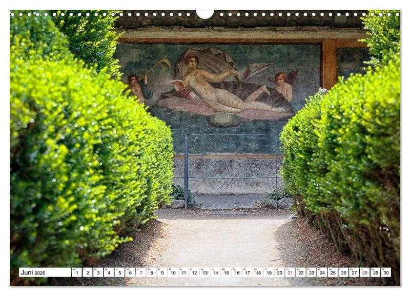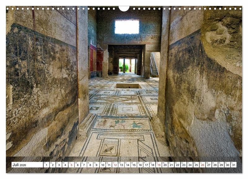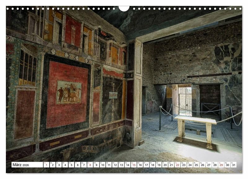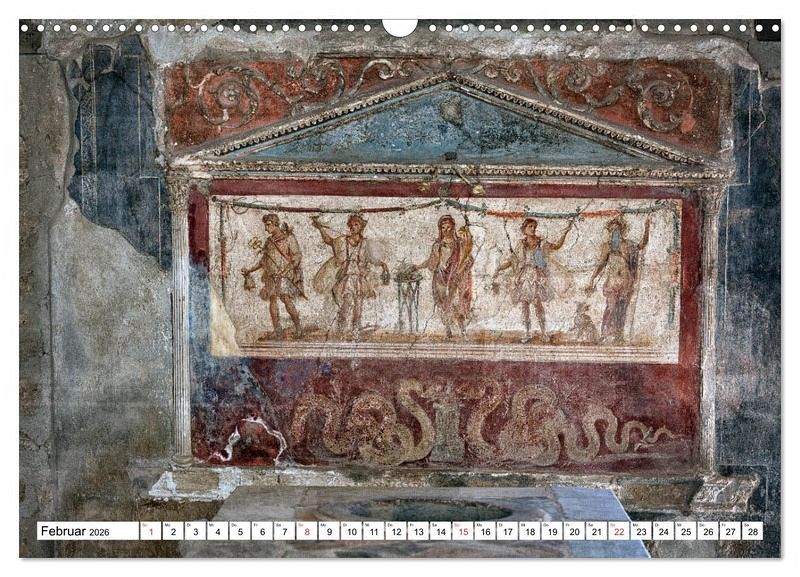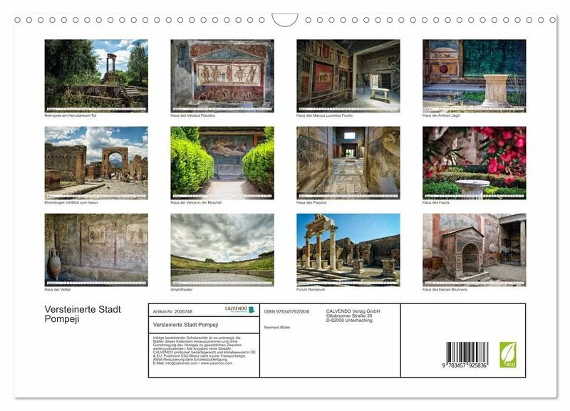 Im Jahre 79 n. Chr. verschüttete der Vesuv die antike Stadt Pompeji unter seinen Lava- und Aschemassen. Die moderne Archäologie bringt nun diese phantastischen Buten zurück an das Licht. Der Kalender zeigt das ganze Jahr über verschiedene Facetten dieses einzigartigen Relikts aus der römischer Antike.
