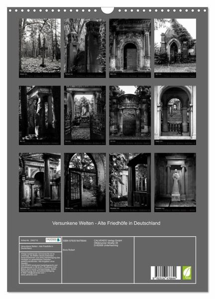 "Historische Friedhöfe spiegeln unser kulturelles und gesellschaftliches Erbe wieder und sind bedeutende Orte der Erinnerung", so Dr. Herlind Gundelach, Präsidentin des Bund Heimat und Umwelt in Deutschland (BHU). Möge dieser Kalender auf die Schätze und Vielfalt der in Deutschland vorhandenen Anlagen aufmerksam machen. Dieser, durchgängig in prächtigen Schwarz/Weiss Fotografien bebilderte Kalender nimmt Sie mit auf eine Zeitreise in eine andere Welt.