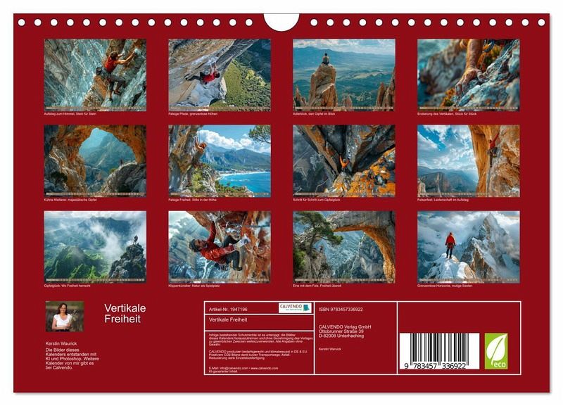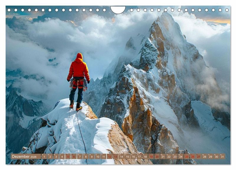 Erleben Sie die Schönheit dieses Sports mit unserem Kalender "Vertikale Freiheit". Tauchen Sie ein in eine Welt grenzenloser Abenteuer und atemberaubender Aussichten, festgehalten durch die KI-generierten Bilder von mutigen Kletterern, die die höchsten Gipfel der majestätischen Gebirge erklimmen. Jeder Monat enthüllt eine neue Szene voller Spannung, Herausforderung und Schönheit, während Sie das Gefühl der Freiheit spüren, das nur das Freiklettern bieten kann. Lassen Sie sich von den kühnen Kletterern und den imposanten Felsformationen inspirieren, während Sie jeden Tag des Jahres das Abenteuer, die Leidenschaft und die Schönheit des Freikletterns genießen. Mit "Vertikale Freiheit" erleben Sie die Welt des Freikletterns, und die Erfüllung des Satzes: Der Weg ist das Ziel.