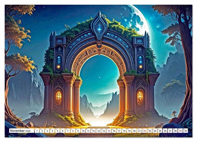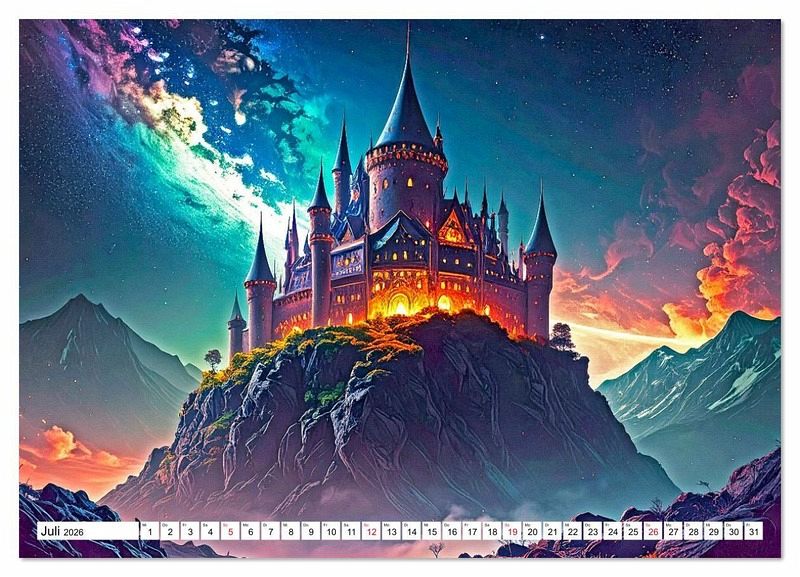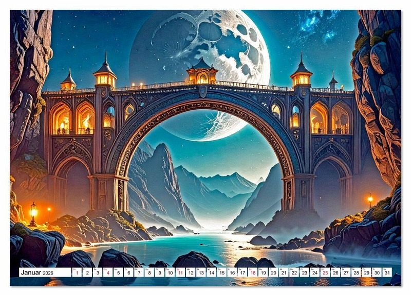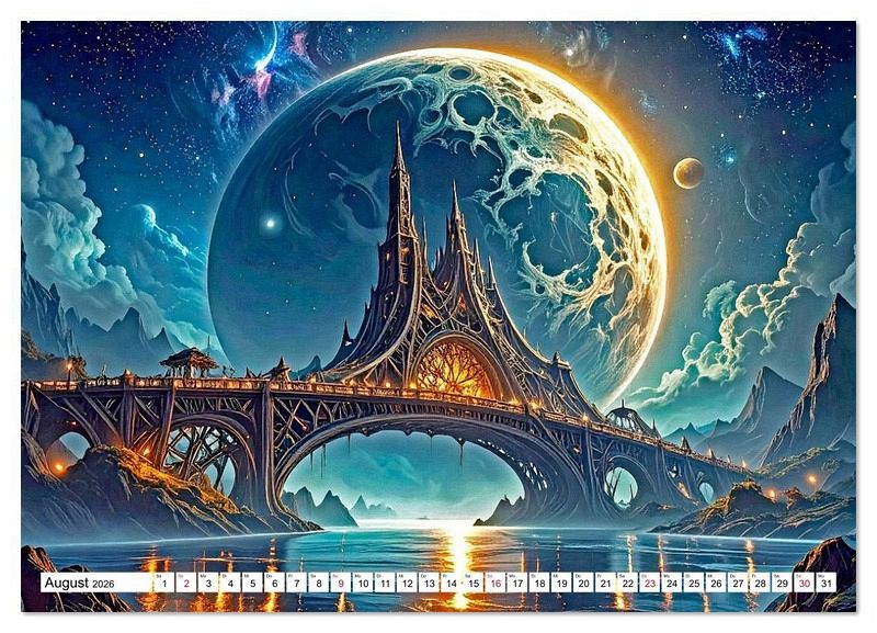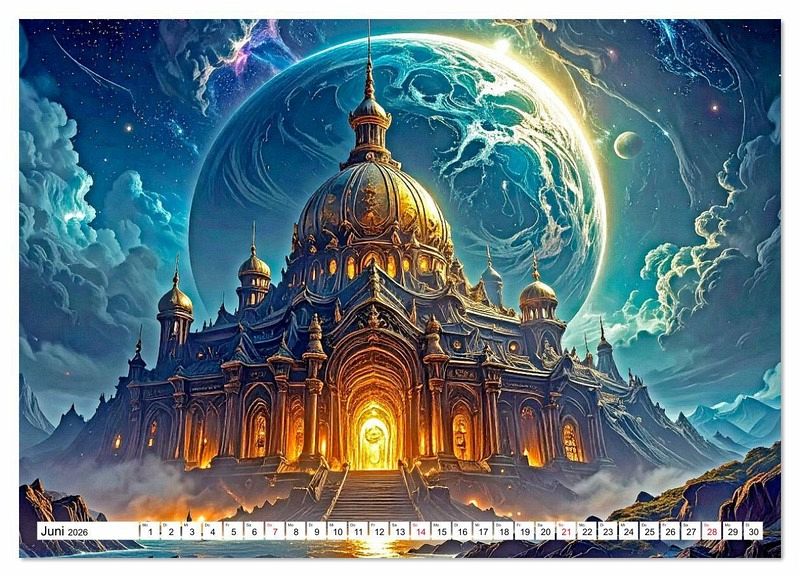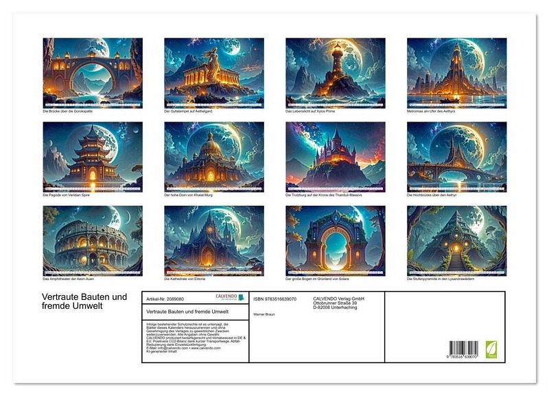 Erleben Sie die geheimnisvolle Schönheit ferner Galaxien in unserem exklusiven Bildkalender. Jedes Blatt entführt Sie auf einen fremden Planeten, wo monumentale, KI-generierte Bauwerke unter einem riesigen Himmelskörper und dramatischen Wolkenformationen in Szene gesetzt sind. Erleben Sie die faszinierende Mischung aus Vertrautem und Fantastischem: Gebäude, die antik oder altertümlich wirken, Architektur, die uns bekannt scheint, versetzt in eine außerirdische Umgebung, eingebettet in eine feuchte, locker bewaldete Landschaft und geheimnisvoll beleuchtet. Jedes Bild hat ein schaurig-schönes Flair und beflügelt Ihre Fantasie, Monat für Monat - ein ganzes Jahr lang.