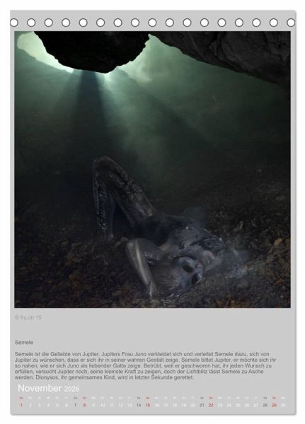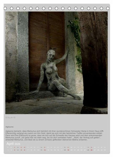 Die "Metamorphosen" des römischen Dichters Ovid ist eine Sammlung von mythologischen Verwandlungsgeschichten. Einige geben "Erklärungen" zu bekannten Erscheinungen wie beispielsweise das Echo, andere Geschichten sind heute nahezu unbekannt. Das Werk hatte immer einen großen Einfluss auf Literatur, bildende Kunst und Psychologie. Der Kalender zeigt zwölf Frauenverwandlungen und gibt dazu eine kurze Textzusammenfassung.