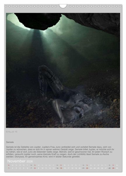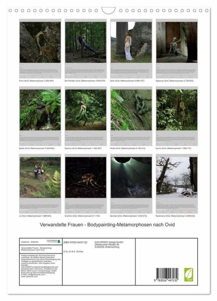 Die "Metamorphosen" des römischen Dichters Ovid ist eine Sammlung von mythologischen Verwandlungsgeschichten. Einige geben "Erklärungen" zu bekannten Erscheinungen wie beispielsweise das Echo, andere Geschichten sind heute nahezu unbekannt. Das Werk hatte immer einen großen Einfluss auf Literatur, bildende Kunst und Psychologie. Der Kalender zeigt zwölf Frauenverwandlungen und gibt dazu eine kurze Textzusammenfassung.
