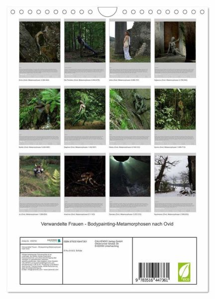 Die "Metamorphosen" des römischen Dichters Ovid ist eine Sammlung von mythologischen Verwandlungsgeschichten. Einige geben "Erklärungen" zu bekannten Erscheinungen wie beispielsweise das Echo, andere Geschichten sind heute nahezu unbekannt. Das Werk hatte immer einen großen Einfluss auf Literatur, bildende Kunst und Psychologie. Der Kalender zeigt zwölf Frauenverwandlungen und gibt dazu eine kurze Textzusammenfassung. Die Redaktion hat diesen Kalender 2016 für die CALVENDO Gold-Edition ausgewählt.