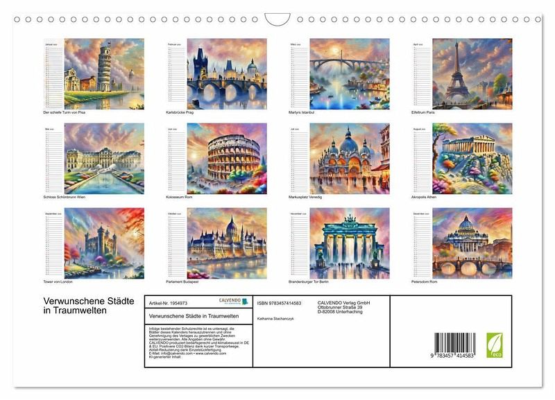 Tauchen Sie ein in eine Welt der Magie und Surrealität. Erleben Sie faszinierende Wahrzeichen von KI interpretiert, die in einer verzauberten Atmosphäre zum Leben erwachen. Jeder Monat enthüllt eine neue surreale Perspektive, die Sie in traumhafte Welten entführt und die Wahrzeichen Ihrer Lieblingsstädte in einem neuen Licht zeigt. Dieser Kalender ist nicht nur eine Hommage an die Architektur und Schönheit der Städte, sondern auch eine Einladung zum Träumen und Entdecken. Perfekt für alle, die sich nach einer Flucht aus dem Alltag sehnen und die Welt mit neuen Augen sehen möchten.