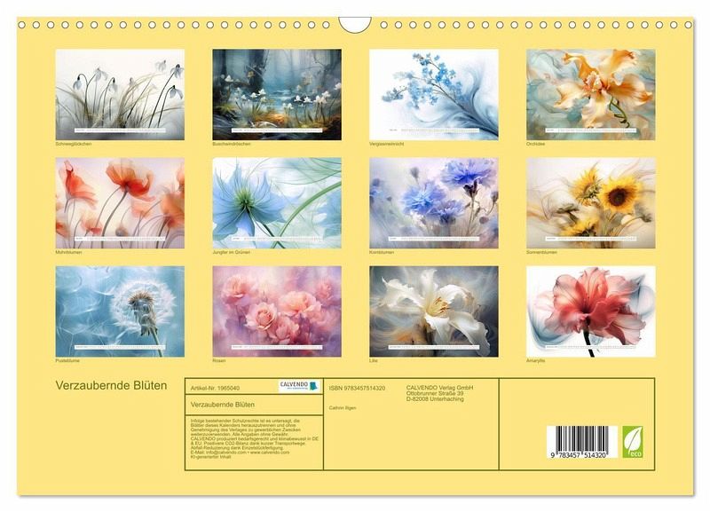 QUALITÄT - Hochwertiger Fotokalender mit 12 wunderschönen Motiven auf lichtbeständigem Bilderdruckpapier, robuste Spiralbindung mit Aufhängebügel.NACHHALTIG - deutliche Abfallreduzierung durch bedarfsgerechte Einzelstückfertigung, umweltfreundliches FSC-zertifiziertes Papier, Produktion in Deutschland, klimabewusste Logistik.PERFEKTES GESCHENK - Kalender für Freunde und Familie, für Kinder und Erwachsene, jung und alt, zu Weihnachten, Geburtstag oder zwischendurch.VIELFALT - Bildkalender in verschiedenen Formaten, z.B. DIN A5, DIN A4, DIN A3 sowie DIN A2. Ob Naturmotiv, Gemälde oder Fotos, ideal für ein persönliches Wohlfühlambiente.Fantasievolle malerische Blüten von Autor(in): Catill
