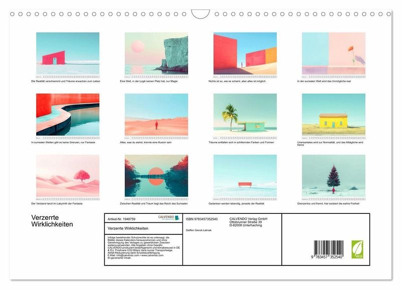 QUALITÄT - Hochwertiger Fotokalender mit 12 wunderschönen Motiven auf lichtbeständigem Bilderdruckpapier, robuste Spiralbindung mit Aufhängebügel.NACHHALTIG - deutliche Abfallreduzierung durch bedarfsgerechte Einzelstückfertigung, umweltfreundliches FSC-zertifiziertes Papier, Produktion in Deutschland, klimabewusste Logistik.PERFEKTES GESCHENK - Kalender für Freunde und Familie, für Kinder und Erwachsene, jung und alt, zu Weihnachten, Geburtstag oder zwischendurch.VIELFALT - Bildkalender in verschiedenen Formaten, z.B. DIN A5, DIN A4, DIN A3 sowie DIN A2. Ob Naturmotiv, Gemälde oder Fotos, ideal für ein persönliches Wohlfühlambiente.Kurzbeschreibung für einen Kalender zum Thema surreale Welt. von Autor(in): Steffen Gierok ; Magik Artist Design