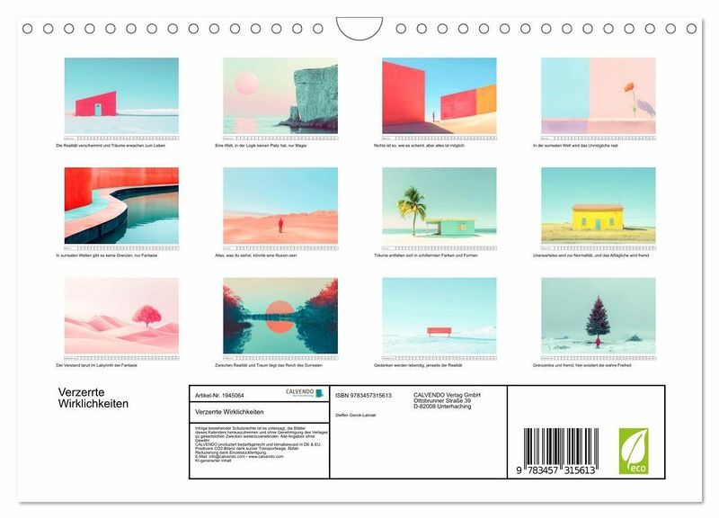 QUALITÄT - Hochwertiger Fotokalender mit 12 wunderschönen Motiven auf lichtbeständigem Bilderdruckpapier, robuste Spiralbindung mit Aufhängebügel.NACHHALTIG - deutliche Abfallreduzierung durch bedarfsgerechte Einzelstückfertigung, umweltfreundliches FSC-zertifiziertes Papier, Produktion in Deutschland, klimabewusste Logistik.PERFEKTES GESCHENK - Kalender für Freunde und Familie, für Kinder und Erwachsene, jung und alt, zu Weihnachten, Geburtstag oder zwischendurch.VIELFALT - Bildkalender in verschiedenen Formaten, z.B. DIN A5, DIN A4, DIN A3 sowie DIN A2. Ob Naturmotiv, Gemälde oder Fotos, ideal für ein persönliches Wohlfühlambiente.Kurzbeschreibung für einen Kalender zum Thema surreale Welt. von Autor(in): Steffen Gierok ; Magik Artist Design
