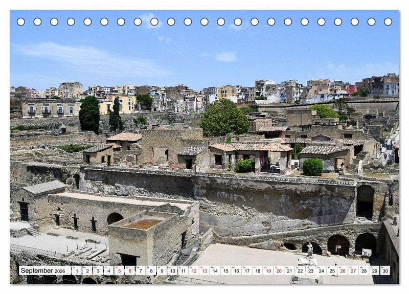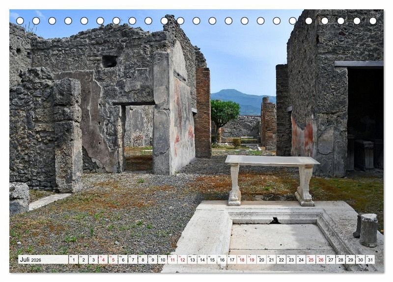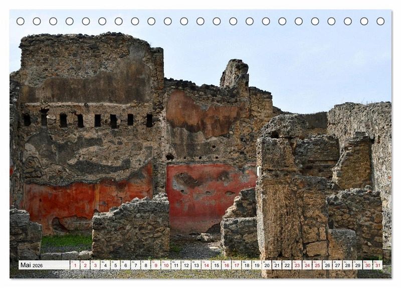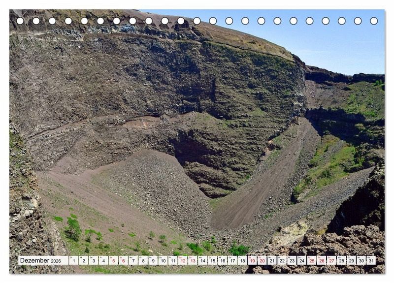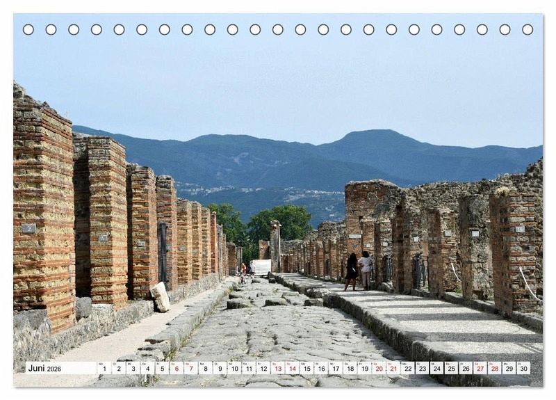 Im Jahr 79 n. Chr. wurden vom verheerenden Vulkanausbruch des Vesuv die Städte Pompeji und Herculaneum vollständig verschüttet. Im 18. Jahrhundert begann man mit den ersten Ausgrabungen. Infolge der natürlichen Konservierung ist vieles erhalten geblieben und der Besucher erlebt hier eine einzigartige antike Welt. Im Kalender zeigt der Autor nicht nur Bilder von den Ausgrabungsstätten, sondern auch vom Vesuv, dem Verursacher der Katastrophe.