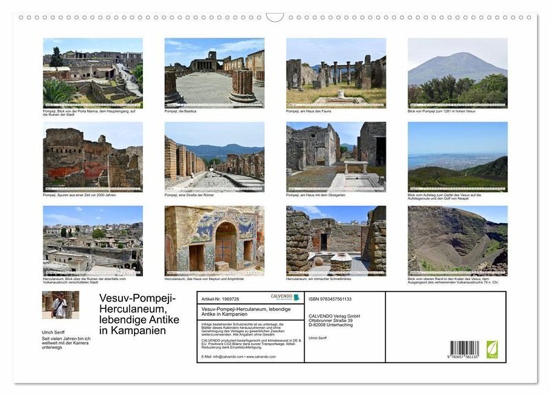 Im Jahr 79 n. Chr. wurden vom verheerenden Vulkanausbruch des Vesuv die Städte Pompeji und Herculaneum vollständig verschüttet. Im 18. Jahrhundert begann man mit den ersten Ausgrabungen. Infolge der natürlichen Konservierung ist vieles erhalten geblieben und der Besucher erlebt hier eine einzigartige antike Welt. Im Kalender zeigt der Autor nicht nur Bilder von den Ausgrabungsstätten, sondern auch vom Vesuv, dem Verursacher der Katastrophe.