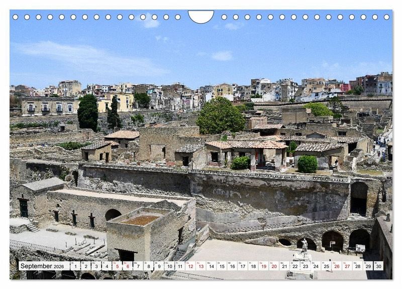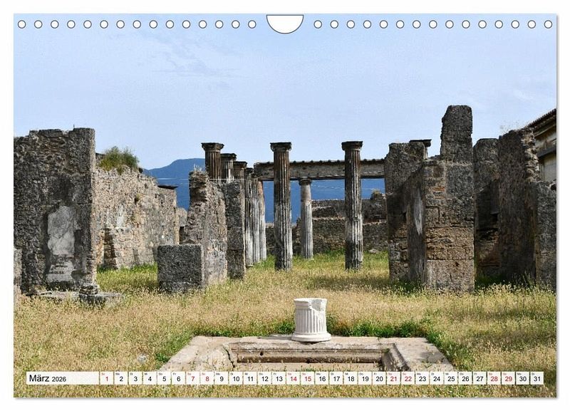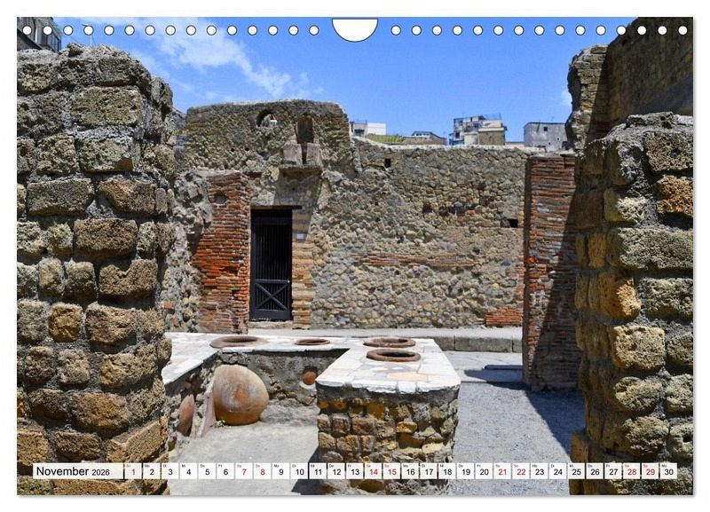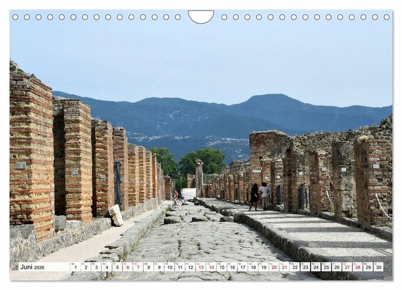 Im Jahr 79 n. Chr. wurden vom verheerenden Vulkanausbruch des Vesuv die Städte Pompeji und Herculaneum vollständig verschüttet. Im 18. Jahrhundert begann man mit den ersten Ausgrabungen. Infolge der natürlichen Konservierung ist vieles erhalten geblieben und der Besucher erlebt hier eine einzigartige antike Welt. Im Kalender zeigt der Autor nicht nur Bilder von den Ausgrabungsstätten, sondern auch vom Vesuv, dem Verursacher der Katastrophe.