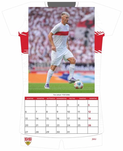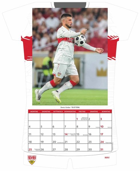 Der VfB Stuttgart Trikotkalender 2026 bringt die weiß-rote Leidenschaft im originellen Trikotdesign direkt an die Wand. Monat für Monat präsentiert er faszinierende Fotografien der spannendsten und erfolgreichsten Spieltage der VfB-Profis – ein Muss für alle, die furchtlos und treu zum Verein stehen. Highlights: - Besonderes Design: Wandkalender in origineller Trikotform – einzigartig & dekorativ - Exklusive Motive: 12 Monatsblätter mit packenden VfB-Spielerszenen - Großes Format: 34 x 42 cm – auffällig und eindrucksvoll - Übersichtlich planen: 2-sprachiges Kalendarium (DE/EN) für klare Terminorganisation - Praktische Spiralbindung: Einfaches Aufhängen & bequemes Umblättern Der VfB Stuttgart Trikotkalender 2026 vereint Fußball-Emotionen und originelles Design – ein echter Hingucker und die perfekte Geschenkidee für alle treuen VfB-Fans. Sprachen: Deutsch, Englisch