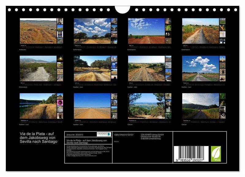 QUALITÄT - Hochwertiger Fotokalender mit 12 wunderschönen Motiven auf lichtbeständigem Bilderdruckpapier, robuste Spiralbindung mit Aufhängebügel.NACHHALTIG - deutliche Abfallreduzierung durch bedarfsgerechte Einzelstückfertigung, umweltfreundliches FSC-zertifiziertes Papier, Produktion in Deutschland, klimabewusste Logistik.PERFEKTES GESCHENK -Kalender für Freunde und Familie, für Kinder und Erwachsene, jung und alt, zu Weihnachten, Geburtstag oder zwischendurch.VIELFALT - Bildkalender in verschiedenen Formaten, z.B. DIN A5, DIN A4, DIN A3 sowie DIN A2. Ob Naturmotiv, Gemälde oder Fotos, ideal für ein persönliches Wohlfühlambiente.Pilgern auf einer alten Römerstraße - 1000 km zu Fuß von Sevilla nach Santiago von Autor(in): Rina B.