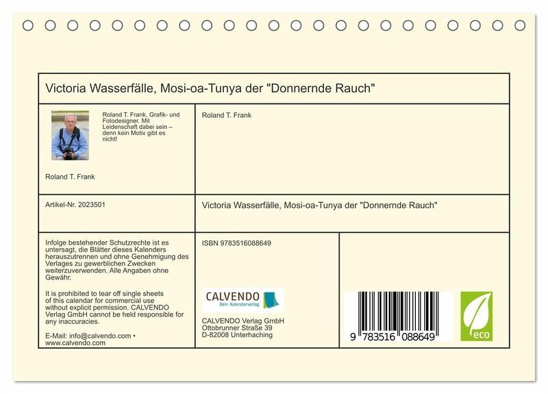 QUALITÄT - Hochwertiger Fotokalender mit 12 wunderschönen Motiven auf lichtbeständigem Bilderdruckpapier, robuste Spiralbindung.NACHHALTIG - deutliche Abfallreduzierung durch bedarfsgerechte Einzelstückfertigung, umweltfreundliches FSC-zertifiziertes Papier, Produktion in Deutschland, klimabewusste Logistik.PERFEKTES GESCHENK - Kalender für Freunde und Familie, für Kinder und Erwachsene, jung und alt, zu Weihnachten, Geburtstag oder zwischendurch.VIELFALT - Bildkalender in verschiedenen Formaten, z.B. DIN A5, DIN A4, DIN A3 sowie DIN A2. Ob Naturmotiv, Gemälde oder Fotos, ideal für ein persönliches Wohlfühlambiente.Seit 1989 gehören die Victoria Wasserfälle zum Weltnaturerbe der UNESCO. von Autor(in): Roland T. Frank