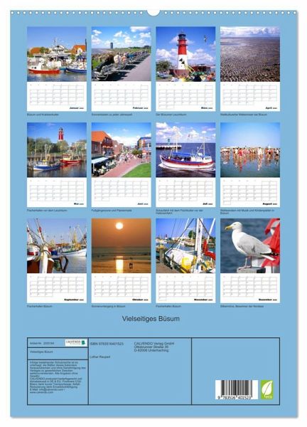 Nordsee-Heilbad Büsum, Weltkulturerbe am Wattenmeer, ist ein sehr belliebter Urlaubsort für Groß und Klein. Jeder findet Erholung, Wellness, ein Wellenbad oder Spiel und Spaß. Schöne Strände, Häfen und eine Menge Highlights warten auf den Besucher. Denn dieser einmalige Küstenort bietet außerdem noch viele weitere Programme, bzw. Wattwandern mit Musik Wattführungen, Krabbenkutterfahrten, Ausflüge per Schiff, Helgolandfahrten, Kinderspiele, Kurkonzerte und vieles mehr. Auch ein Tagesrlaub ist ein lohnendes, tolles Erlebnis, das lange in Erinnerung bleibt. Dieser Kalender zeigt Büsum in seiner Vielfalt.