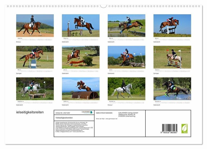 PREMIUM-LINIE - Brillanter Fotokalender mit 12 wunderschönen Motiven, Kunstdruck in Hochglanz in Museumsqualität.QUALITÄT - edle Materialien, stabile Rückwand mit 2 innovativen Einstecktaschen für eine optimale Präsentation an der Wand.NACHHALTIG - deutliche Abfallreduzierung durch bedarfsgerechte Einzelstückfertigung, umweltfreundliches FSC-zertifiziertes Papier, Produktion in Deutschland, klimabewusste Logistik.PERFEKTES GESCHENK - Kalender für Freunde und Familie, für Kinder und Erwachsene, jung und alt, zu Weihnachten, Geburtstag oder zwischendurch.Fotoimpressionen vom Vielseitigkeitsreiten, dem reitsportlichen Triathlon, der drei verschiedene Disziplinen in einem Wettbewerb vereint: Dressur, Geländeritt und Springen. von Autor(in): Anke van Wyk