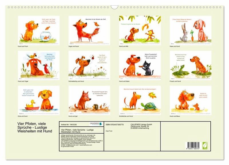Der Kalender "Vier Pfoten, viele Sprüche - Lustige Weisheiten mit Hund" begleitet dich mit liebevoll KI-illustrierten Hundemotiven und klugen, witzigen Weisheiten durchs Jahr. Ob schmunzelnd, nachdenklich oder einfach herzerwärmend - dieser Kalender bringt Monat für Monat ein Lächeln in deinen Alltag. Perfekt für Hundefreunde, Tierliebhaber und alle, die den kleinen Alltagsmomenten mit Humor begegnen möchten. Ideal auch als Geschenk!