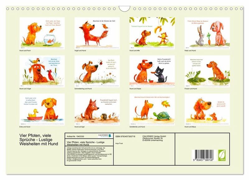 Der Kalender "Vier Pfoten, viele Sprüche - Lustige Weisheiten mit Hund" begleitet dich mit liebevoll KI-illustrierten Hundemotiven und klugen, witzigen Weisheiten durchs Jahr. Ob schmunzelnd, nachdenklich oder einfach herzerwärmend - dieser Kalender bringt Monat für Monat ein Lächeln in deinen Alltag. Perfekt für Hundefreunde, Tierliebhaber und alle, die den kleinen Alltagsmomenten mit Humor begegnen möchten. Ideal auch als Geschenk!