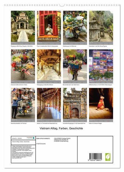 Dieser Kalender bietet einen fotografischen Einblick in das facettenreiche Vietnam. Farbenprächtige Märkte, kunstvolle Tempel, Szenen des Alltags und architektonische Details zeichnen ein authentisches Bild des südostasiatischen Landes. Die Bilder zeigen historische Stätten ebenso wie moderne Eindrücke aus dem Straßenleben und spiegeln die kulturelle Vielfalt zwischen Tradition und Gegenwart wider.