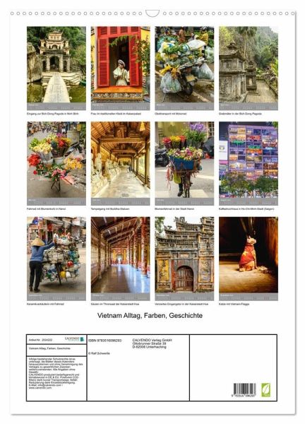 Dieser Kalender bietet einen fotografischen Einblick in das facettenreiche Vietnam. Farbenprächtige Märkte, kunstvolle Tempel, Szenen des Alltags und architektonische Details zeichnen ein authentisches Bild des südostasiatischen Landes. Die Bilder zeigen historische Stätten ebenso wie moderne Eindrücke aus dem Straßenleben und spiegeln die kulturelle Vielfalt zwischen Tradition und Gegenwart wider.