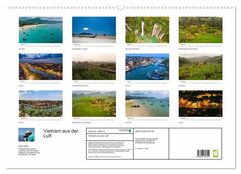 QUALITÄT - Hochwertiger Fotokalender mit 12 wunderschönen Motiven auf lichtbeständigem Bilderdruckpapier, robuste Spiralbindung mit Aufhängebügel.NACHHALTIG - deutliche Abfallreduzierung durch bedarfsgerechte Einzelstückfertigung, umweltfreundliches FSC-zertifiziertes Papier, Produktion in Deutschland, klimabewusste Logistik.PERFEKTES GESCHENK - Kalender für Freunde und Familie, für Kinder und Erwachsene, jung und alt, zu Weihnachten, Geburtstag oder zwischendurch.VIELFALT - Bildkalender in verschiedenen Formaten, z.B. DIN A5, DIN A4, DIN A3 sowie DIN A2. Ob Naturmotiv, Gemälde oder Fotos, ideal für ein persönliches Wohlfühlambiente.Mit der Drohne unterwegs in Vietnam von Autor(in): Heike Adam