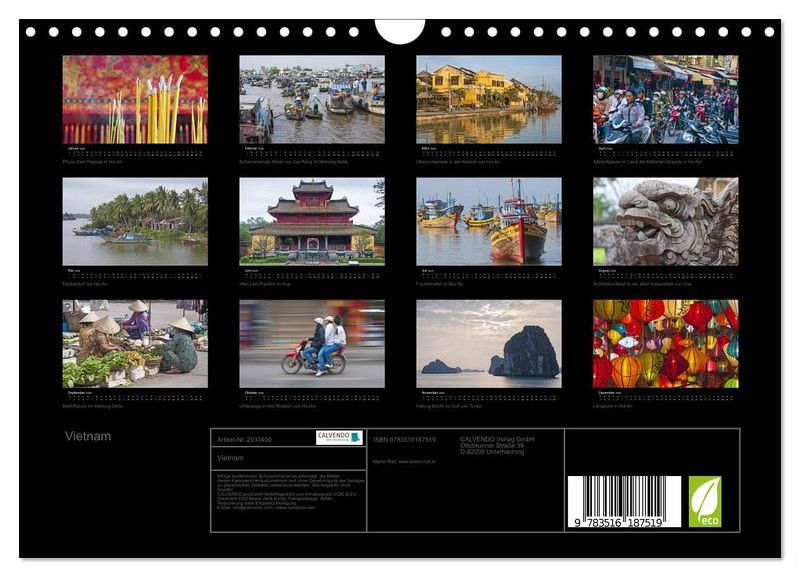 Lebhafte Märkte zu Land und zu Wasser mit einer unvergleichlich großen Auswahl, alte Tempel in denen die Zeit scheinbar über Jahrhunderte stillgestanden ist, spirituelle und besinnliche Momente in den religiösen Stätten und im Gegensatz dazu das turbulente Treiben in den Millionenstädten sowie vor allem die freundlichen Menschen Vietnams. Mit diesem Kalender erleben Sie eine Fotoreise durch eines der faszinierendsten Länder Südostasiens.