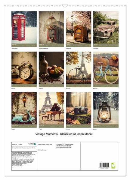 QUALITÄT - Hochwertiger Fotokalender mit 12 wunderschönen Motiven auf lichtbeständigem Bilderdruckpapier, robuste Spiralbindung mit Aufhängebügel.NACHHALTIG - deutliche Abfallreduzierung durch bedarfsgerechte Einzelstückfertigung, umweltfreundliches FSC-zertifiziertes Papier, Produktion in Deutschland, klimabewusste Logistik.PERFEKTES GESCHENK - Kalender für Freunde und Familie, für Kinder und Erwachsene, jung und alt, zu Weihnachten, Geburtstag oder zwischendurch.VIELFALT - Bildkalender in verschiedenen Formaten, z.B. DIN A5, DIN A4, DIN A3 sowie DIN A2. Ob Naturmotiv, Gemälde oder Fotos, ideal für ein persönliches Wohlfühlambiente.Vintage Moments - Klassiker für jeden Monat von Autor(in): Melanie Kremer