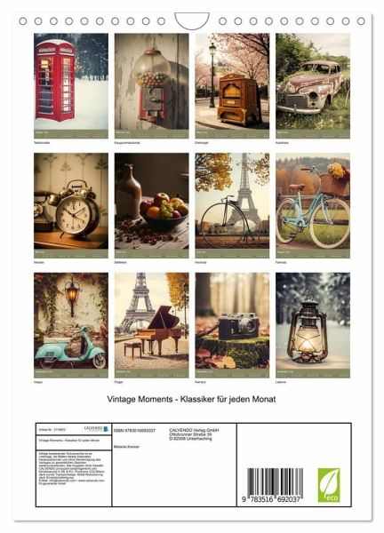 QUALITÄT - Hochwertiger Fotokalender mit 12 wunderschönen Motiven auf lichtbeständigem Bilderdruckpapier, robuste Spiralbindung mit Aufhängebügel.NACHHALTIG - deutliche Abfallreduzierung durch bedarfsgerechte Einzelstückfertigung, umweltfreundliches FSC-zertifiziertes Papier, Produktion in Deutschland, klimabewusste Logistik.PERFEKTES GESCHENK - Kalender für Freunde und Familie, für Kinder und Erwachsene, jung und alt, zu Weihnachten, Geburtstag oder zwischendurch.VIELFALT - Bildkalender in verschiedenen Formaten, z.B. DIN A5, DIN A4, DIN A3 sowie DIN A2. Ob Naturmotiv, Gemälde oder Fotos, ideal für ein persönliches Wohlfühlambiente.Vintage Moments - Klassiker für jeden Monat von Autor(in): Melanie Kremer
