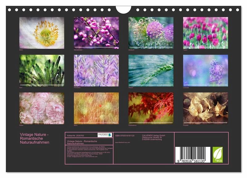 QUALITÄT - Hochwertiger Fotokalender mit 12 wunderschönen Motiven auf lichtbeständigem Bilderdruckpapier, robuste Spiralbindung mit Aufhängebügel.NACHHALTIG - deutliche Abfallreduzierung durch bedarfsgerechte Einzelstückfertigung, umweltfreundliches FSC-zertifiziertes Papier, Produktion in Deutschland, klimabewusste Logistik.PERFEKTES GESCHENK - Kalender für Freunde und Familie, für Kinder und Erwachsene, jung und alt, zu Weihnachten, Geburtstag oder zwischendurch.VIELFALT - Bildkalender in verschiedenen Formaten, z.B. DIN A5, DIN A4, DIN A3 sowie DIN A2. Ob Naturmotiv, Gemälde oder Fotos, ideal für ein persönliches Wohlfühlambiente.Kunstvolle Blumen, Blüten und Naturaufnahmen im trendigen Vintage Stil von Autor(in): Martina Cross