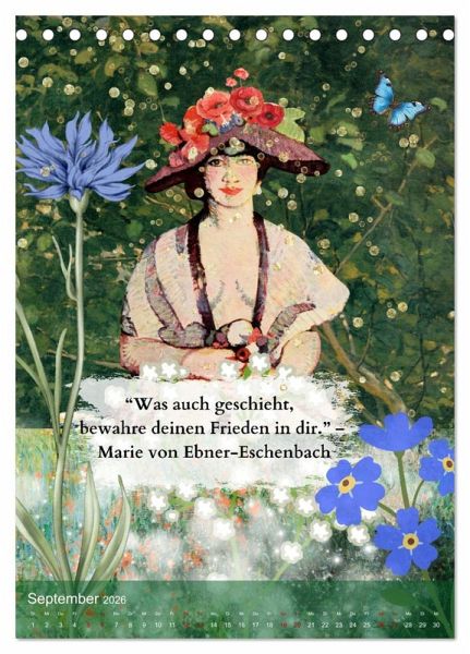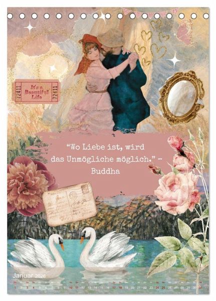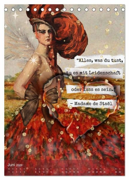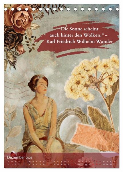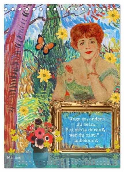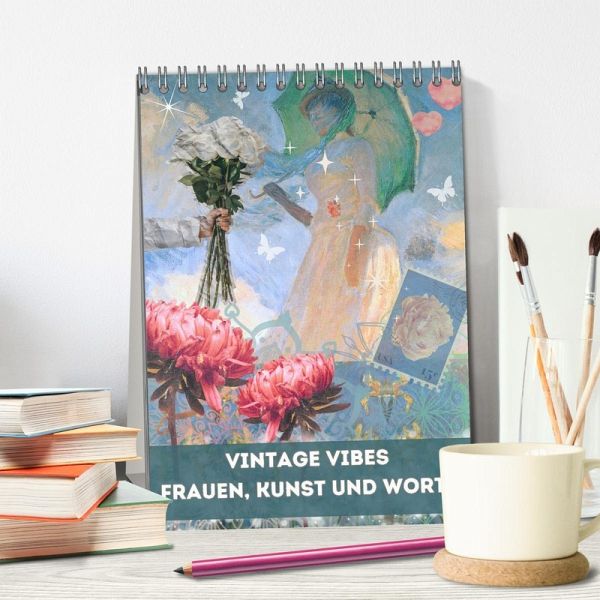 Inspiriert von ikonischen Frauenmotiven aus Meisterwerken, wie zum Beispiel Claude Monets oder Gustav Klimts, verbindet jede Collage klassische Kunst mit nostalgischen Vintage-Elementen zu einem harmonischen Gesamtbild. Abgerundet wird jeder Monat durch ein motivierendes Zitat oder einen inspirierenden Spruch. Ein kunstvoller Begleiter durch das Jahr - für mehr Kreativität, Mut und positive Gedanken im Alltag.