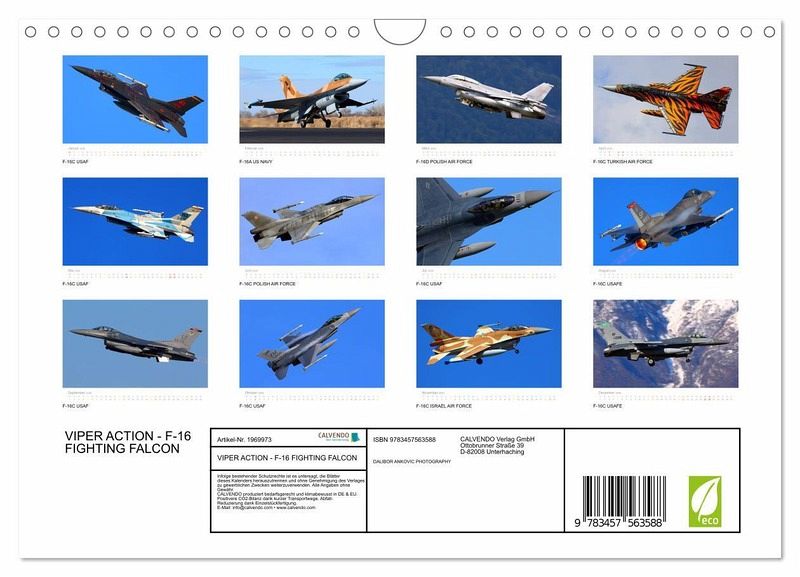 Die F-16 Fighting Falcon von Ihren Piloten einfach nur "VIPER" genannt ist seit fast 50 Jahren in mehr wie 25 Ländern und mit mehr wie 4600 gebauten Exemplaren einer der besten und legendärsten Kampfflugzeuge die auch in den nächsten 20-30 Jahren nicht in Rente geschickt wird. Dieser Kalender zeigt die actionreiche Welt dieses Jets in verschiedensten Facetten.