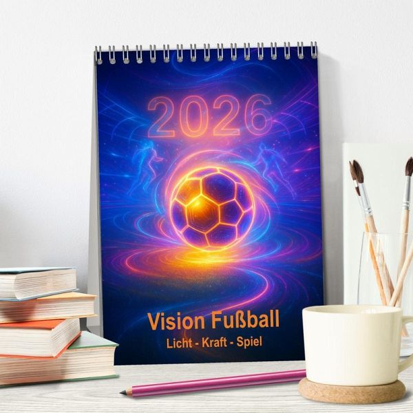 2026 - Vision Fußball zeigt das Spiel, wie du es noch nie gesehen hast: voller Dynamik, Licht und Emotion. In leuchtenden Neonfarben erwachen mit KI generierte Fallrückzieher, Zweikämpfe und Teamgeist-Momente zu futuristischem Leben. Dieser Kalender fängt nicht nur den Sport ein - sondern die Magie, die ihn antreibt. Für alle, die Fußball spüren, sehen und feiern wollen.